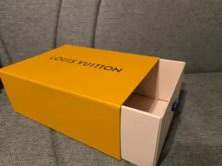 Elegante scatola Louis Vuitton con un design a cassetto, perfetta per conservare oggetti preziosi. Misure: 30 * 22 * 12 - Colore esterno giallo vivace. - Interno color beige. - Logo Louis Vuitton stampato sul coperchio.