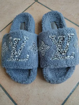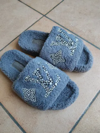Comode pantofole Louis Vuitton in morbido tessuto grigio, decorate con strass. - Dettagli a forma di stella con strass.Regalo mai utilizzato. Taglia 36, colore grigio