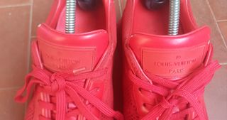Vendo un paio di sneakers Louis Vuitton originali con scatola. Sono in buone condizioni, presentano una tomaia in maglia di colore rosso intenso e dettagli in pelle. - Modello: Sneakers - Materiale: Maglia e pelle - vedere foto per usura pelle e suola