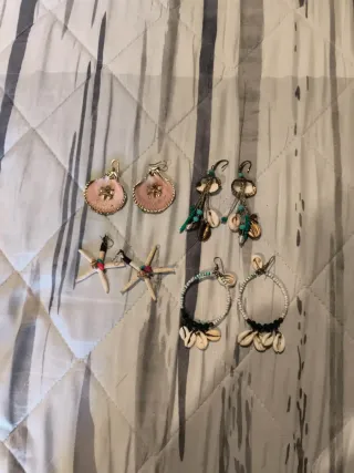 Bellissimo, accattivante e originale set di quattro paia di orecchini a tema marino. - Orecchini a forma di conchiglia e stella marina con perle all'interno. - Orecchini con dettagli di stelle marine e piccole conchiglie. - Orecchini con perline e conchiglie. - Cerchi azzurri con conchiglie pendenti. - Chiusura con gancio. Venduti in lotto a prezzo non negoziabile di 40€. Non sono in argento. Se si desiderano singolarmente, prezzo non negoziabile di 15€ per coppia.