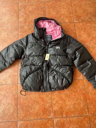 Giubbotto imbottito Stüssy taglia S con un design moderno e accattivante. Perfetto per mantenerti al caldo con stile. - Esterno nero lucido. - Fodera interna rosa vibrante. - Chiusura con zip frontale. - Cappuccio integrato.