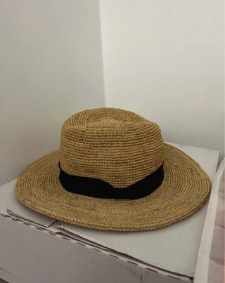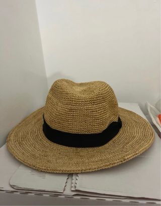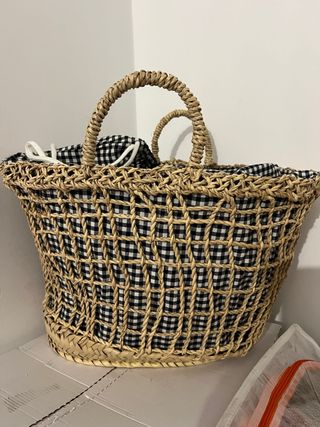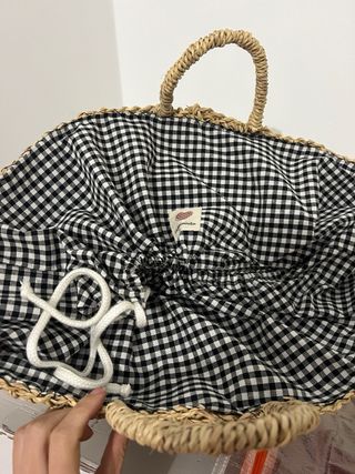 Capazo di rafia con un rivestimento interno a quadri vichy fatto a mano