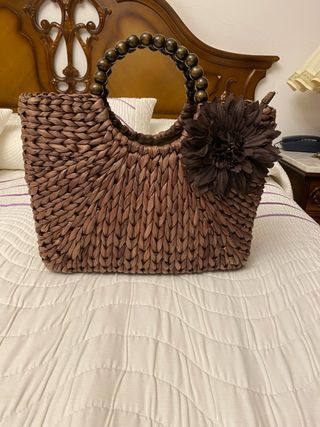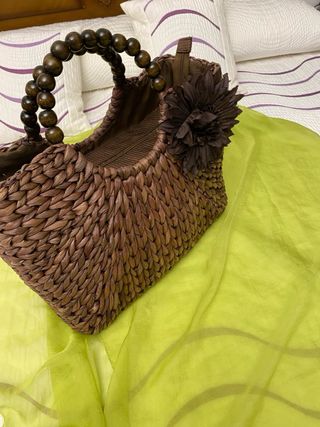 Borsa in rafia con un design unico ed elegante, perfetta per completare il tuo stile. - Manici in legno con perline. - Decorazione floreale. - Materiale in rafia intrecciata.