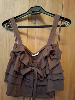 Maglietta a spalla con un design femminile e affascinante. Dettaglio con volant a cascata. Fiocco frontale. Spalline sottili.