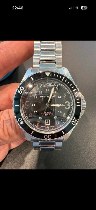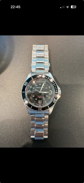 Hamilton Khaki Navy Scuba Automatic H645150. Movimento automatico svizzero (calibro ETA 2834-2). Cassa in acciaio inossidabile. Diametro cassa: ca. 41 mm. Vetro: zaffiro resistente ai graffi. Lunetta girevole unidirezionale. Corona filettata con logo Hamilton. Fondo trasparente (si può vedere il movimento). Produzione: Swiss Made. Con la sua scatola e documentazione. Resistenza all'acqua: 100 m.
