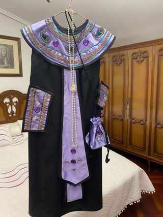 Abito d'epoca Castrexa, confezionato artigianalmente. Un design unico con dettagli ispirati alla cultura castreña. - Tessuto principale in tono beige. - Adorños e cintura in marrone e righe. - Collo a punta con dettaglio decorativo. - Maniche corte con rifinitura in pizzo. - Lunghezza fino ai piedi. Una taglia 44, ma adatto anche ad altre taglie. La taglia 42 è stata indossata una volta.