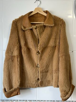 Cappotto in Pelliccia di Coniglio Reale - Pezzo Unico - Taglia M Splendido cappotto vintage realizzato in pelliccia di coniglio 100% naturale. Colore marrone caramello con una consistenza estremamente morbida e fodera interna satinata. Presenta eleganti dettagli in pelliccia scamosciata (ante) sul collo e sui polsini. Chiusura frontale con bottoni e design artigianale esclusivo, si tratta di un pezzo unico di alta qualità. Stato: Vintage in eccellenti condizioni. Misure approssimative: Spalle: ~44 cm. Da spalla a spalla (petto): ~52 cm. Lunghezza totale: ~68 cm.