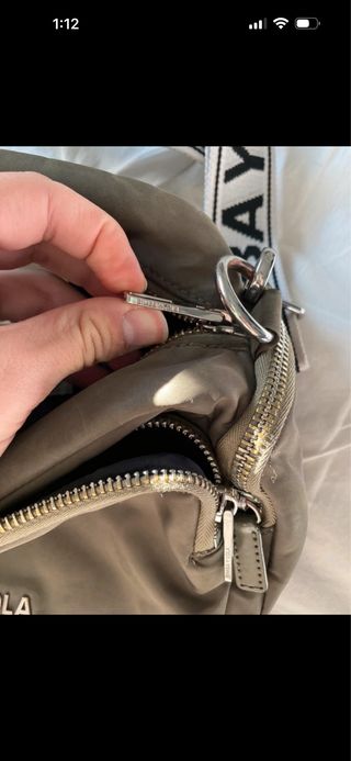 Borsa del marchio Bimba y Lola in colore verde oliva. La cerniera a metà si chiude male. Ecco perché il prezzo. - Tracolla con logo. - Chiusura con cerniera.