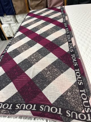 Sciarpa Tous con un design a quadri nei toni del viola, bianco e grigio. Il tessuto presenta un motivo ripetuto del marchio. - Design a quadri. - Motivo del marchio Tous.