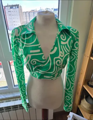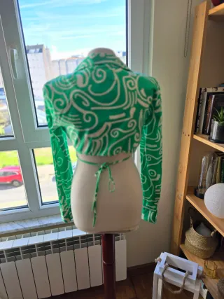 Blusa crop asimmetrica con stampa accattivante. Design incrociato. Manica lunga. Collo alla coreana.
