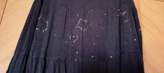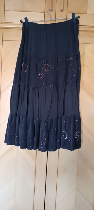 Gonna lunga in stile bohémien con dettagli di paillettes. Design a strati. Paillettes in alto e in basso. Tessuto leggero e fluido. Lunghezza 72 cm. Con elastan.