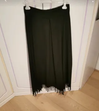 Gonna lunga Souvenir modello a portafoglio. - Dettaglio con fibbie in ecopelle. - Fondo con frange. - Taglia unica. Souvenir, gonna lunga, modello a portafoglio con doppia chiusura marrone in pelle o simile, frange sul bordo inferiore, piegone sul retro, 50% lana, calda e avvolgente, taglia s, calza fino a una 42. Nuova con etichetta, pari al nuovo. #souvenir #souvenirclubbing #skirt #gonnalunga