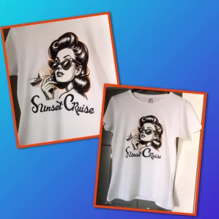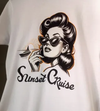 T-shirt bianca con stampa Sunset Cruise in stile retrò. Nuova mai indossata. Taglia L e misure dettagliate in Foto. - Stampa raffigurante una donna con occhiali da sole e un veliero al tramonto. - Design ispirato agli anni '50. - Maniche corte. Codice M 49