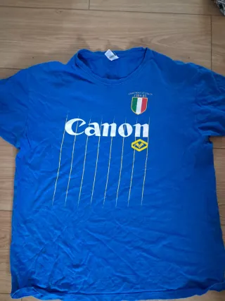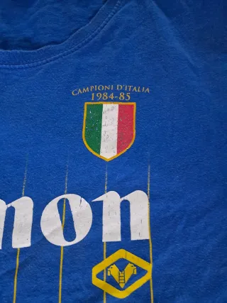 Maglietta celebrativa Campioni d'Italia 1984-85. - Logo Canon stampato sul petto. - Dettagli a righe gialle. - Stemma Campioni d'Italia con scudo tricolore.