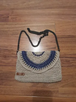 Elegante borsetta realizzata all'uncinetto, perfetta per aggiungere un tocco di stile. - Motivo a semicerchio con dettagli blu. - Tracolla a catena metallica. - Chiusura a patta. - Piccola etichetta in pelle applicata.