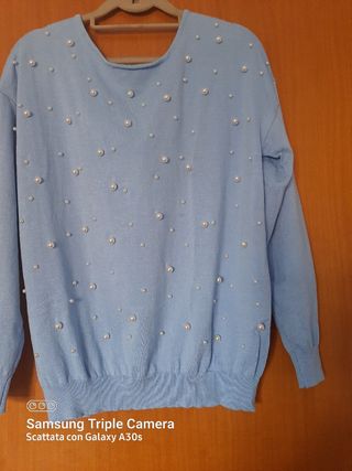 Maglioncino primaverile celeste con perline davanti e fiocco dietro. 90% viscosa 10% poliestere. Mai usato. Nuovo.