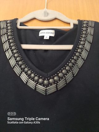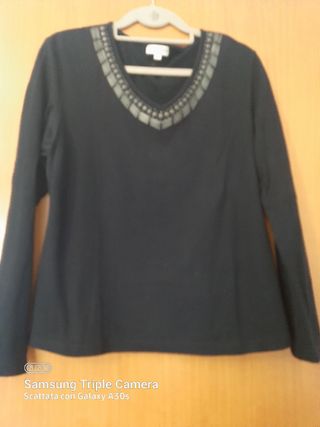 Vendo maglietta manica lunga donna nera, taglia 52. Tessuto morbido e leggermente elasticizzato. Lo scollo è decorato con un delicato motivo ricamato con perle cucite sul tessuto. Taglia 52 italiana. Nuovo con cartellino. #magliettadonna #magliettamanichelunghe #magliadonna #magliadonnamanicalunga #sottogiacca #sottogiaccadonna #sottogiaccaelegante #sottogiaccanero #sottogiaccanuovoconcartellino