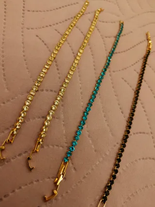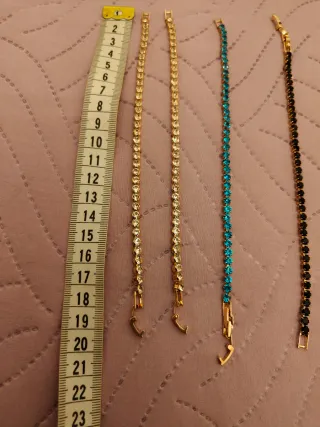 Set di bracciali tennis con dettagli in rame e vetro. Quattro bracciali stile tennis. Il bracciale nero è da sistemare ed è in regalo. - Bracciali con pietre blu e nero. - Bracciali con pietre trasparenti.
