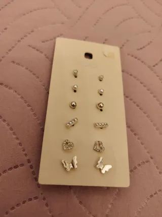 Set di 6 paia di orecchini con diverse forme. Nuovi. - Orecchini a forma di stella. - Orecchini a forma di perla. - Orecchini a forma di pallina. - Orecchini a forma di barretta con strass. - Orecchini a forma di cuore con strass. - Orecchini a forma di farfalla.