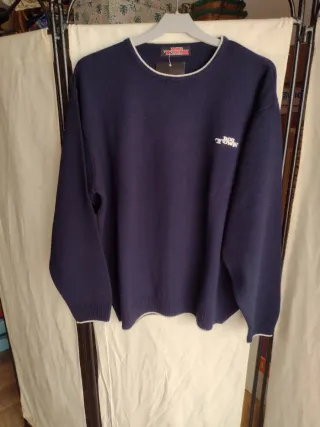 Maglione in maglia blu per uomo della marca Dog Town. È un capo nuovo che conserva ancora l'etichetta originale. - Collo tondo con bordo bianco. - Logo del marchio ricamato in bianco sulla parte anteriore. - Polsini e fondo con finitura a coste e bordo bianco.