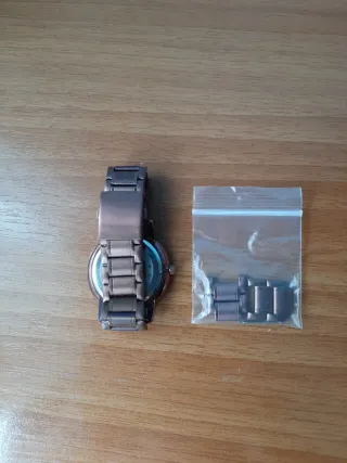 Orologio elegante da uomo con un design moderno e sofisticato. Batteria scarica. Maglie per allargare. Cinturino in metallo marrone rame. Quadrante rotondo con dettagli sottili.