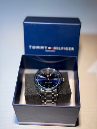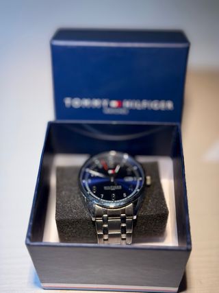 Orologio elegante Tommy Hilfiger da uomo, con una combinazione di colori blu e argento. Design moderno e sofisticato. Cinturino con maglie metalliche. Manca sostituire le batterie.