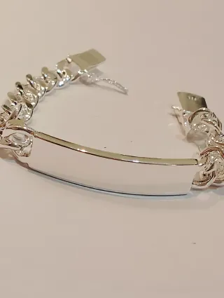 Bracciale in argento massiccio per uomo. Design elegante e robusto. - Argento massiccio. - Design a maglie. - Piastra centrale liscia. - Peso 52 g. - Piastra pronta per incisione.