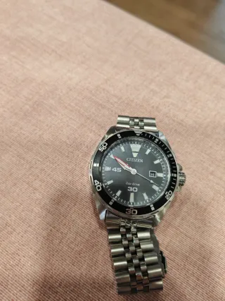 Orologio da polso Citizen con movimento Eco-Drive, ottime condizioni, completo di scatolo, garanzia (scaduta) cinturino jubilee sostituito con uno di ottima fattura e maglie aggiuntive del cinturino - Cassa e bracciale in acciaio inossidabile. - Quadrante nero. - Lunetta girevole unidirezionale.