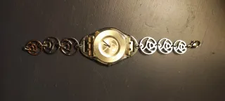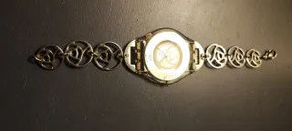 L'orologio Swatch nella foto è un modello della linea Skin. Si tratta del modello "Japan Roses" con codice SFK268G. Funzionante Caratteristiche principali Modello e Anno: Swatch Skin "Japan Roses", rilasciato nel 2006. Design del Bracciale: Il bracciale è realizzato in acciaio inossidabile color oro con un design unico a maglie formate da cerchi intrecciati che ricordano delle rose. Cassa: La cassa è in plastica trasparente, ultra-sottile, con un diametro di 34 mm, una caratteristica distintiva della collezione Swatch Skin. Vetro leggermente graffiato