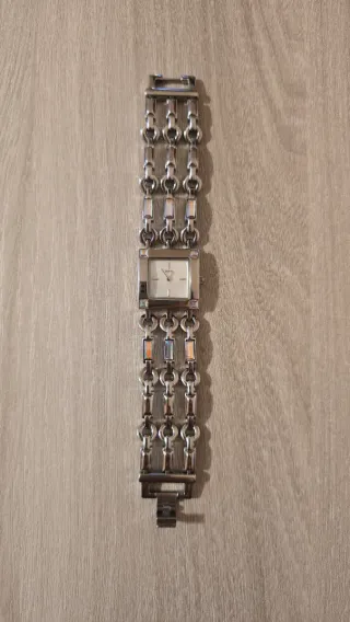 Elegante orologio da polso Guess con cassa e bracciale in acciaio. - Design moderno con maglie a catena spesse. - Quadrante rettangolare. - Chiusura a scomparsa. evidenti segni di usura, funzionante ma necessario cambio batteria