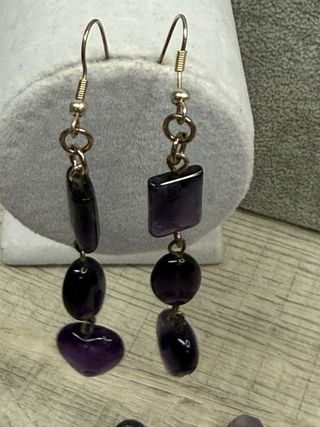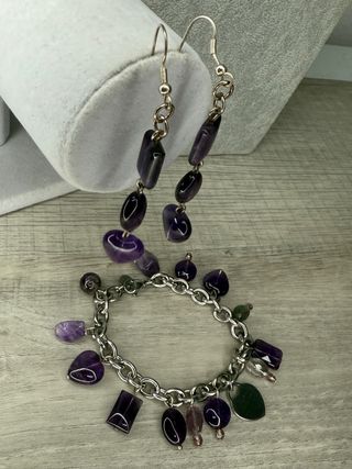 Elegante set di bracciale e orecchini con pietre di ametista e dettagli in acciaio. - Bracciale con maglie in acciaio e ciondoli assortiti in ametista - Orecchini pendenti con pietre sfaccettate montati argento - Design unico e raffinato.