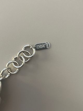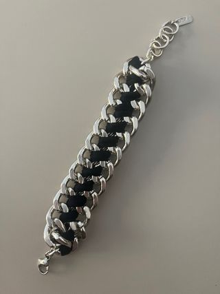 Elegante bracciale DIM con un design intrecciato che combina argento e nero. Un accessorio distintivo per completare il tuo look. - Maglie a catena spesse. - Inserti in tessuto nero. - Chiusura a moschettone.
