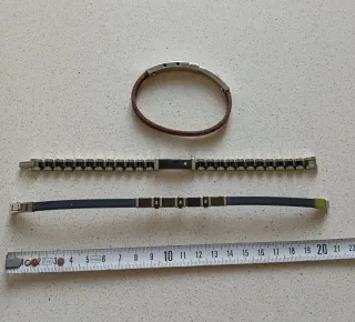 Set di tre bracciali in stile vintage anni 90 . - Bracciale con cordino in pelle marrone e inserti in metallo. - Bracciale a catena con maglie in metallo e inserto centrale nero. - Bracciale con cinturino in gomma nera e dettagli in metallo.
