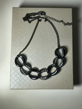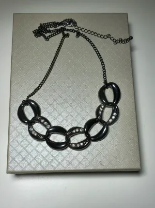 Elegante collana girocollo in metallo grigio scuro, impreziosita da luminosi strass. - Design a maglie ovali. - Dettagli scintillanti. - Chiusura a moschettone con catenella regolabile. - Nuova mai usata