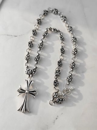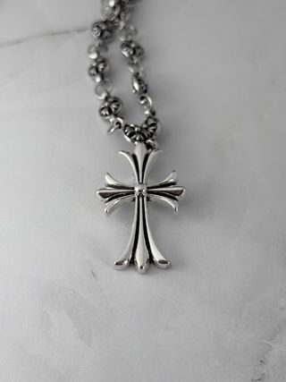 Collana con pendente a forma di croce gotica e maglie con incisioni. - Materiale: acciaio - Lunghezza catena 50 cm - Colore: argento - Chiusura a T