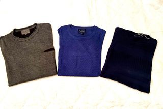 Lotto composto da tre maglie da uomo. - Una maglia grigia a righe con dettaglio. - Una maglia blu con trama a rombi. - Una maglia blu scuro con texture.