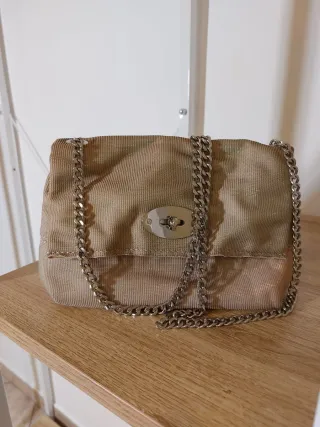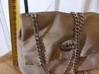 Elegante pochette Bata color cipria dai riflessi cangianti, perfetta per ogni occasione. La sua tracolla argentata aggiunge un tocco di classe. - Tessuto con fili dorati. - Chiusura a girello argentata. - Catena a maglie.