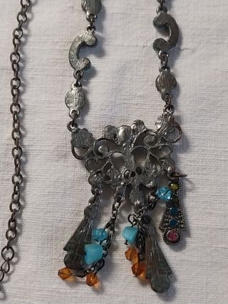 Peso 34 grammi, lunghezza totale 47 cm, (n.3177) Collana in metallo con dettagli decorativi e perline colorate. - Design unico ispirato agli anni '70. - Elementi pendenti con pietre. - Catena a maglie fini.