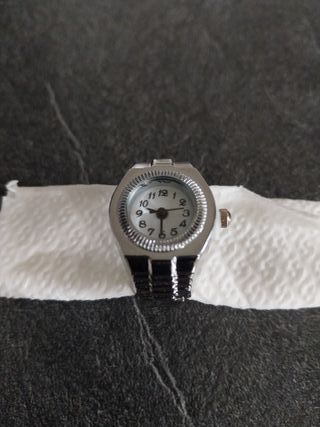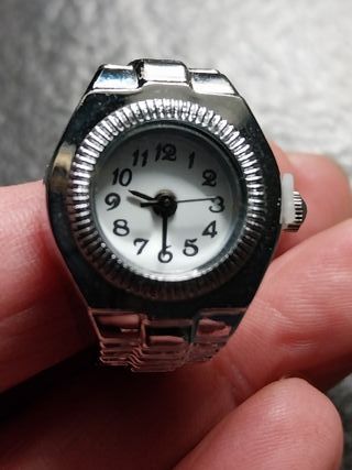 Originale anello a forma di orologio, un accessorio unico. Anello a orologio. Diametro 2 cm, si allarga da solo, corona elasticizzata. Nuovo ancora con il blocco al pomello (n.3206) - Design moderno e accattivante. - Cinturino a maglie. - Quadrante con numeri romani.