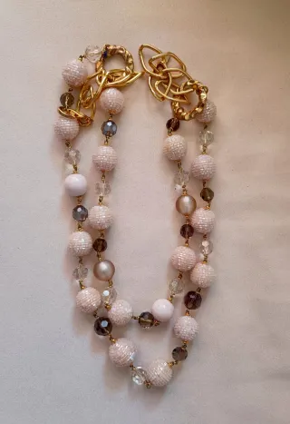 Collana Statement a Doppio Filo – Perle Rivestite e Cristalli Smoky – Stile Vintage Dettagli principali: * Design: Modello a doppio filo con un mix di perle di diverse dimensioni e finiture. * Materiali: * Perle materiche: Grandi sfere rivestite meticolosamente di micro-perline color cipria (seed beads), che creano un effetto mosaico. * Elementi in cristallo: Perle sfaccettate in vetro o resina di alta qualità nei toni del trasparente e dello "smoky quartz" (grigio fumo). * Dettagli metallici: Catena a maglie grosse e chiusura a moschettone in metallo dorato lucido. * Colori: Nude/Rosa cipria, Champagne, Grigio fumo e Oro.