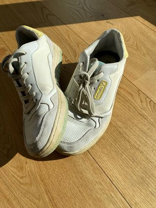 Scarpe da ginnastica Victoria da uomo. - Tomaia in pelle bianca. - Dettagli in pelle scamosciata grigia. - Inserti gialli sul tallone e sul logo. - Suola in gomma.