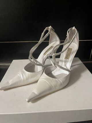 Eleganti scarpe da sposa Guido la Rocca, impreziosite da cristalli Swarovski. - Design a punta con cinturino incrociato. - Dettagli scintillanti lungo i listini. - Chiusura posteriore con zip.
