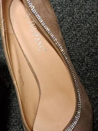 Eleganti scarpe con tacco del marchio Tulipano. - Decorazione con strass lungo il bordo. - Design a punta. - Colore marrone con dettagli argento.