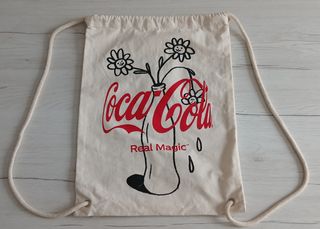 Borsa in tessuto con coulisse, perfetta per portare con te tutto il necessario. - Fantasia a tema Coca-Cola con disegno di fiori e bottiglia. - Colore di base beige con logo rosso Coca-Cola. - Coulisse per chiusura e tracolle. Borsa sacco in tessuto cocacola Con disegno floreale e scritta real magic