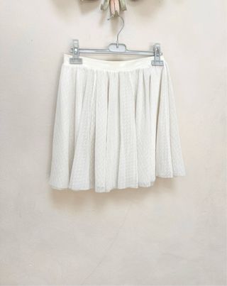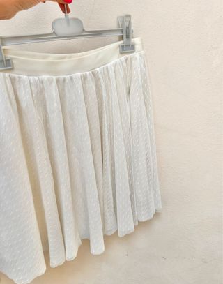 Questa è una gonna corta di colore bianco dal design delicato e femminile. Ecco una descrizione dettagliata: • Modello: Gonna a pieghe con taglio corto, sopra al ginocchio. La pieghettatura conferisce volume e un effetto svasato molto elegante. • Tessuto: Il tessuto esterno è un tulle leggero e trasparente, decorato con un motivo a pois in rilievo (tipo plumetis), che aggiunge una texture raffinata. Sotto il tulle una fodera chiara, per garantire opacità. • Vita: Fascia in vita liscia, elastica • Stile: Romantico e delicato, adatto per la primavera/estate. Ideale per outfit casual chic, cerimonie diurne, o abbinata a top leggeri