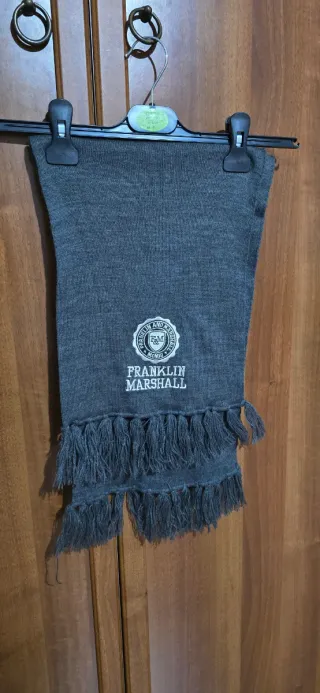 Sciarpa in maglia grigia con logo. - Logo Franklin Marshall ricamato. - Fondo con frange. - Materiale in maglia morbida.