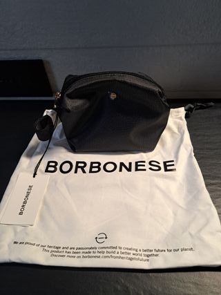 Elegante trousse Borbonese in tessuto nero. Chiusura con zip dorata. Inclusa dust bag, ancora sigillata.
