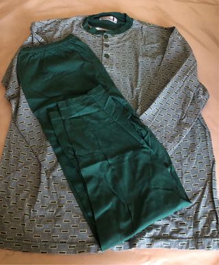 Set di due pigiami da uomo in cotone, taglia XXL. Un pigiama è blu con fantasia a rombi, l'altro è verde con fantasia geometrica. - Pigiama blu con bottoni e taschino. - Pigiama verde con colletto e bottoni.