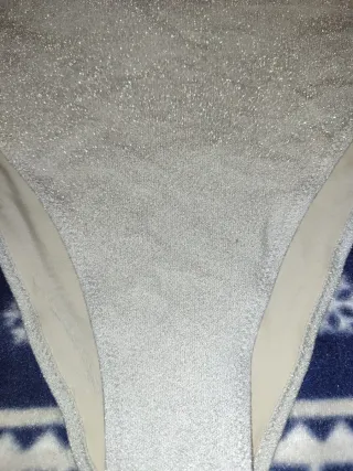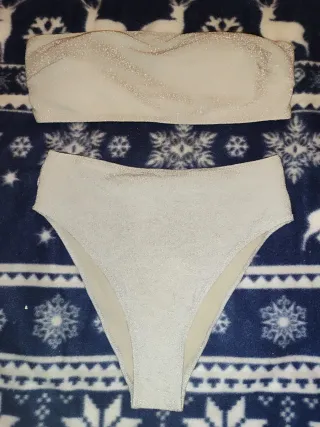 Costume due pezzi nuovo,composto da slip taglia 40 e reggiseno taglia 42. Il tessuto presenta una finitura scintillante,Slip vita alta,Reggiseno a fascia.
