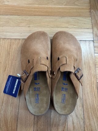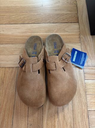 Sabot Birkenstock Boston in morbida pelle scamosciata color marrone. Modello comodo e versatile. - Tomaia in pelle scamosciata. - Soletta in sughero e lattice. - Fibbia regolabile in metallo.